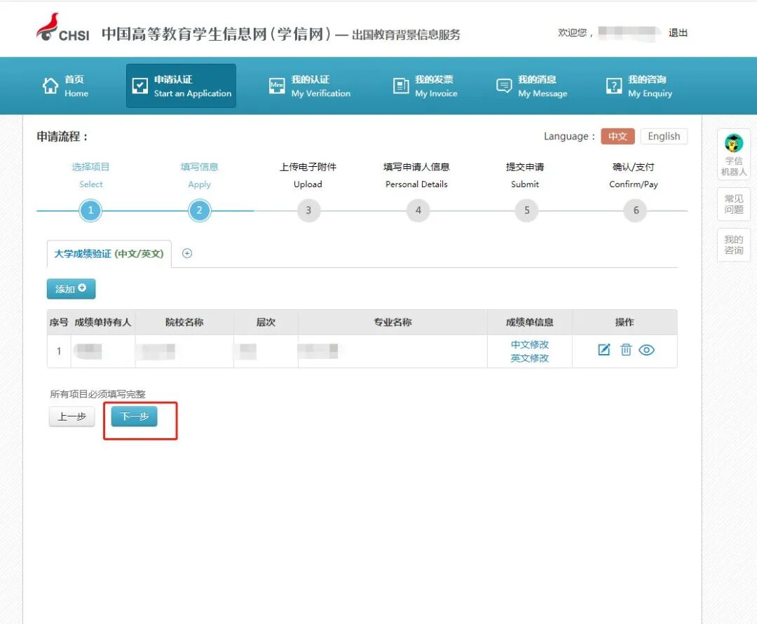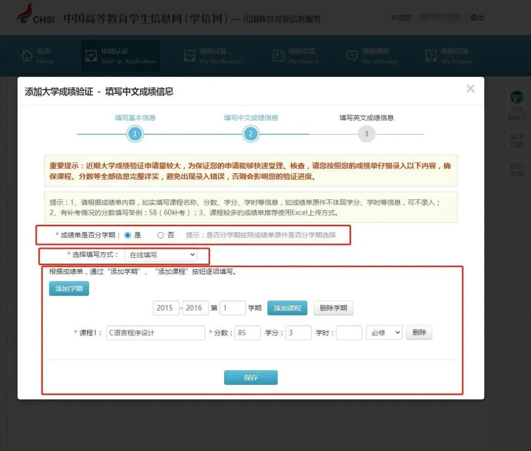 发表时间:2024-06-28 21:16 所需材料 中文成绩单扫描件,英文成绩单扫描件,身份证正反面扫描件,毕业证书扫描件。 相关要求: 1、在申请材料中,毕业证书、成绩单必须原件彩色扫描,使用复印件扫描、电脑屏幕截图、手机拍照的均不合格; 2、每张图片大小控制在2MB以内,只限jpg/png格式; 3、请保持图片清晰可辨,分辨率在200*200以上; 4、身份证正反两面; 5、证书中的印章完整清晰; 6、带星号为必传项; 7、所有材料均需清晰扫描(成绩单-中文,成绩单-英文,身份证,毕业证书) 认证步骤 1、进入学信网官网,选择出国教育背景服务选项。 ![]() 2、选择网上申请。 ![]() 3、选择点击进入网上申请系统(Start an Application)。 ![]() 4、输入自己的账号密码,点击登录。 ![]() 5、选择申请认证。 ![]() 6、选择新申请。 ![]() 7、填写对应信息,申请目的选择其他留学,填写自己申请的对应国家或地区(eg:英国),填写要申请的学校或机构(eg:牛津大学剑桥大学),勾选对应的大学成绩验证,中文+英文,然后选择下一步。 ![]() 8、等待30s,选择我已阅读并同意上述内容。 ![]() 9、添加大学成绩验证,点击添加按钮。 ![]() 10、填写对应的个人基本信息,注意加*项必须填写,填写完毕后,选择保存并添加课程。 ![]() 11、按照成绩单是否分学期,选择是或否,填写方式选择在线填写(Excel上传易出错)。 若分学期,则选择添加学期,然后在该学期后选择添加课程,填入对应的课程名,分数,学分,是否必修等必填信息,全部填写完毕后选择保存进入下一步。 ![]() 若不分学期,则直接选择在线填写,选择添加课程,填写对应信息。全部填写完毕后选择保存进入下一步。 12、填写对应的课程名的英文名称,全部填写完毕后,选择保存。 ![]() 13、选择下一步。 ![]() 14、选择上传对应的材料,所有材料上传完毕后选择下一步。 ![]() 15、填写对应信息,填写完成后选择保存并进入下一步。 ![]() 16、选择对应的受理机构,以及是否需要报销,核实无误后点击提交申请,然后付款就完成了。 ![]()